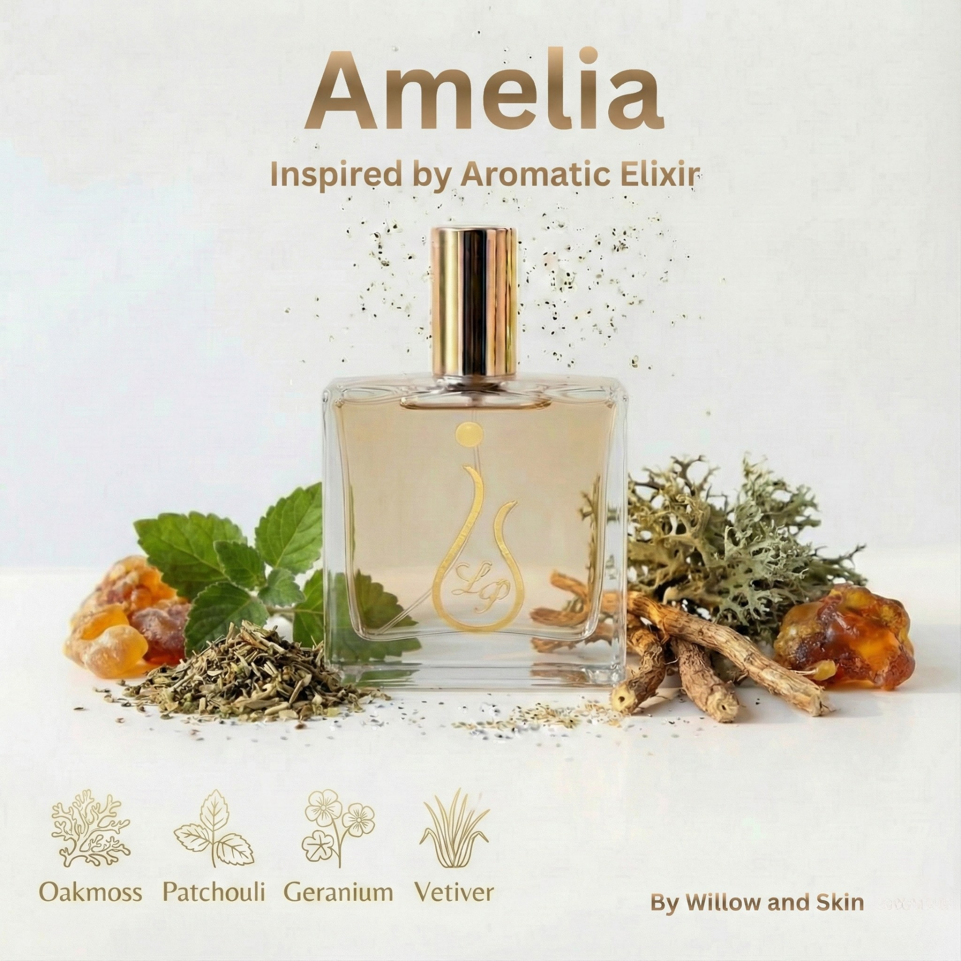 Amelia is a bold, captivating chypre floral perfume with a warm, earthy elegance. It opens with bright herbs and soft citrus, then moves into a rich floral heart that feels confident and expressive. As it settles, the scent becomes warm, deep, and slightly woody with a smooth, classic finish.